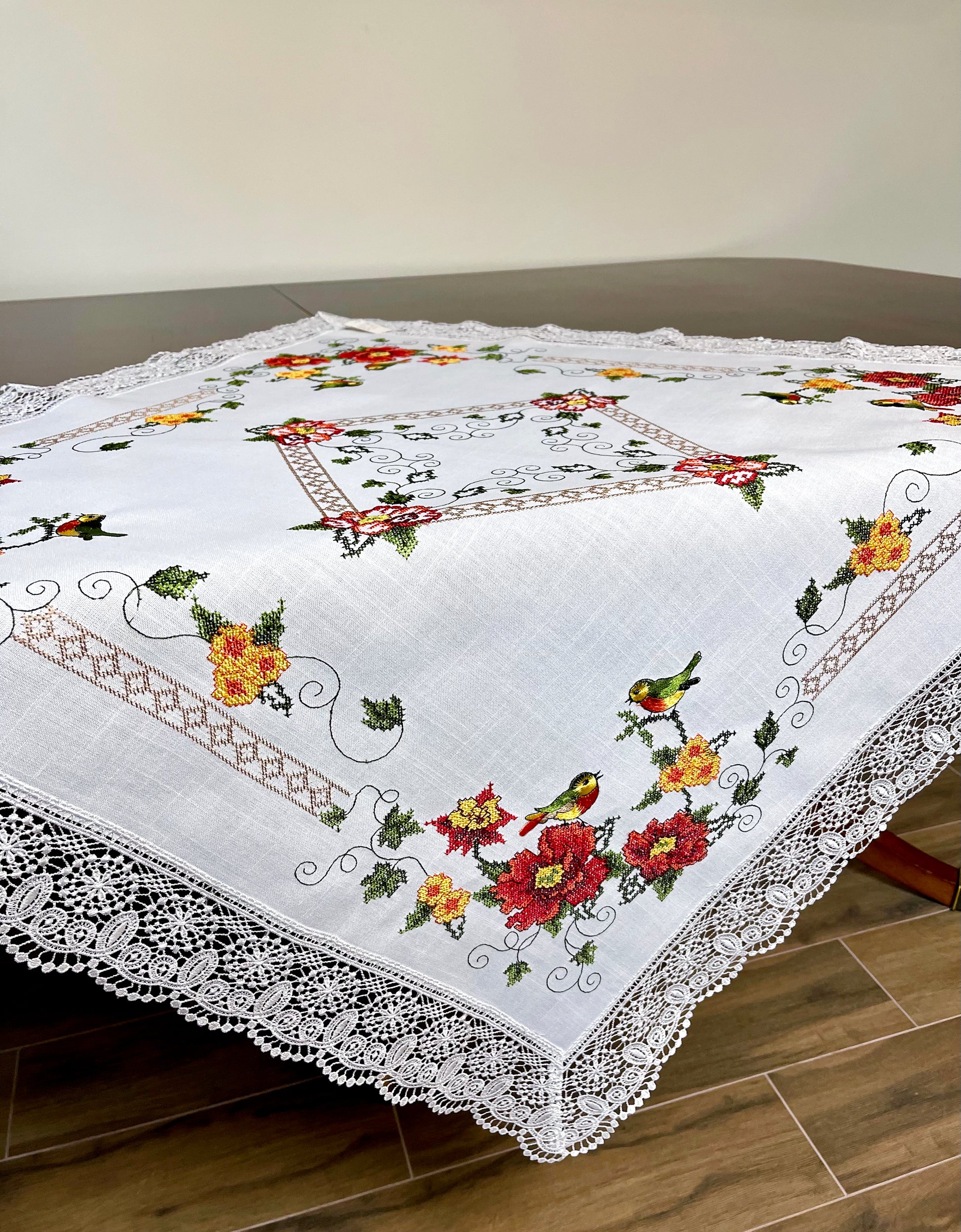 The Betty Bird Collection features a pair of cute birds embroidered on cross-stitched flowers.