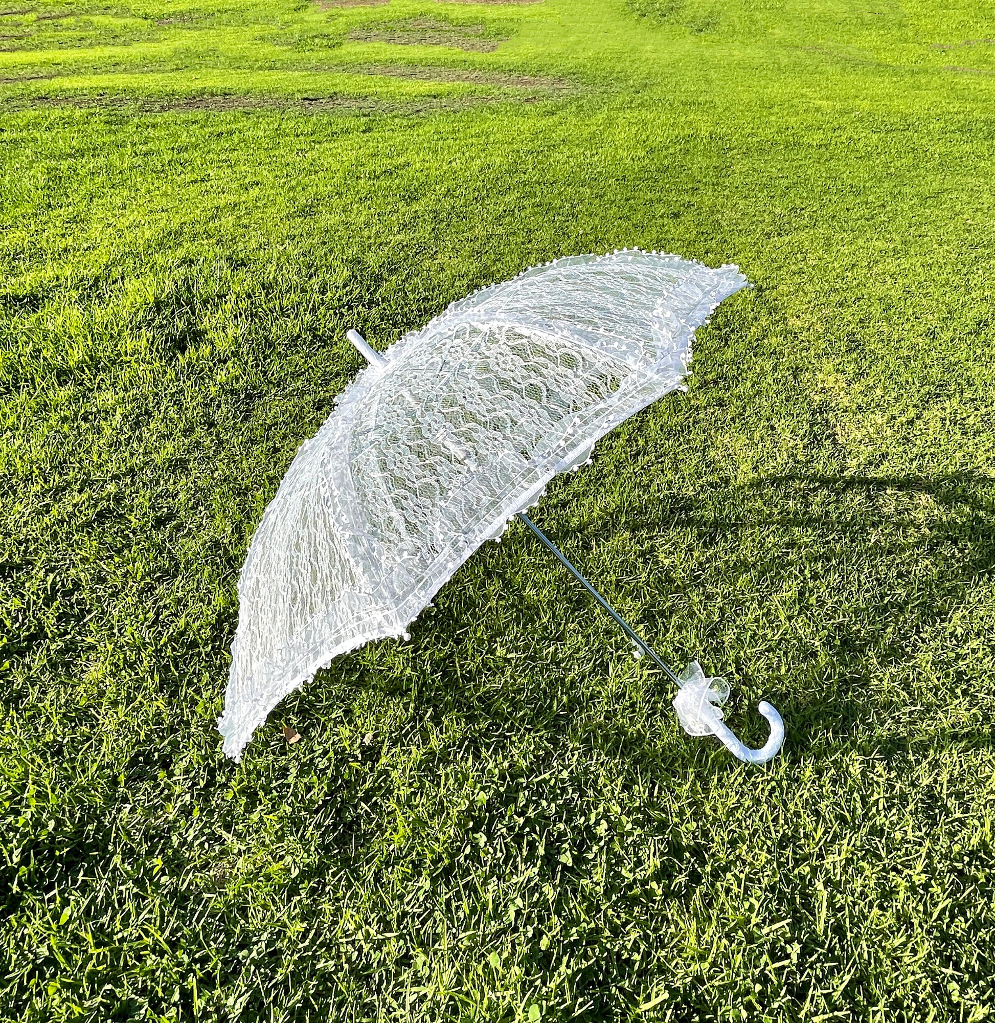 Elegant white lace parasol with metal rod.