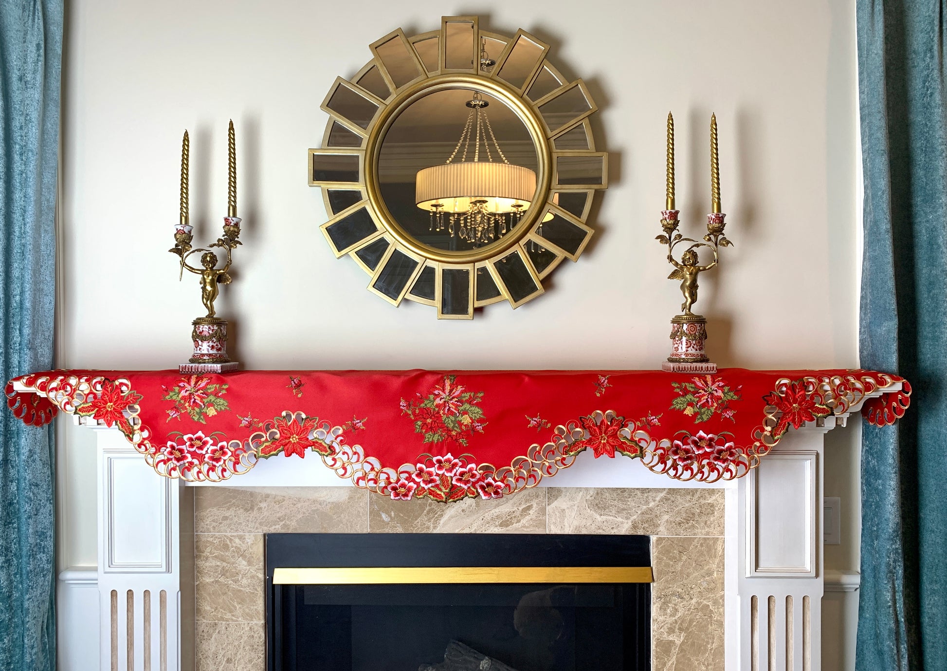 The Dalia Mantel Scarf with cross-stitched poinsettia flowers will bring a festive mood to your entire household.
