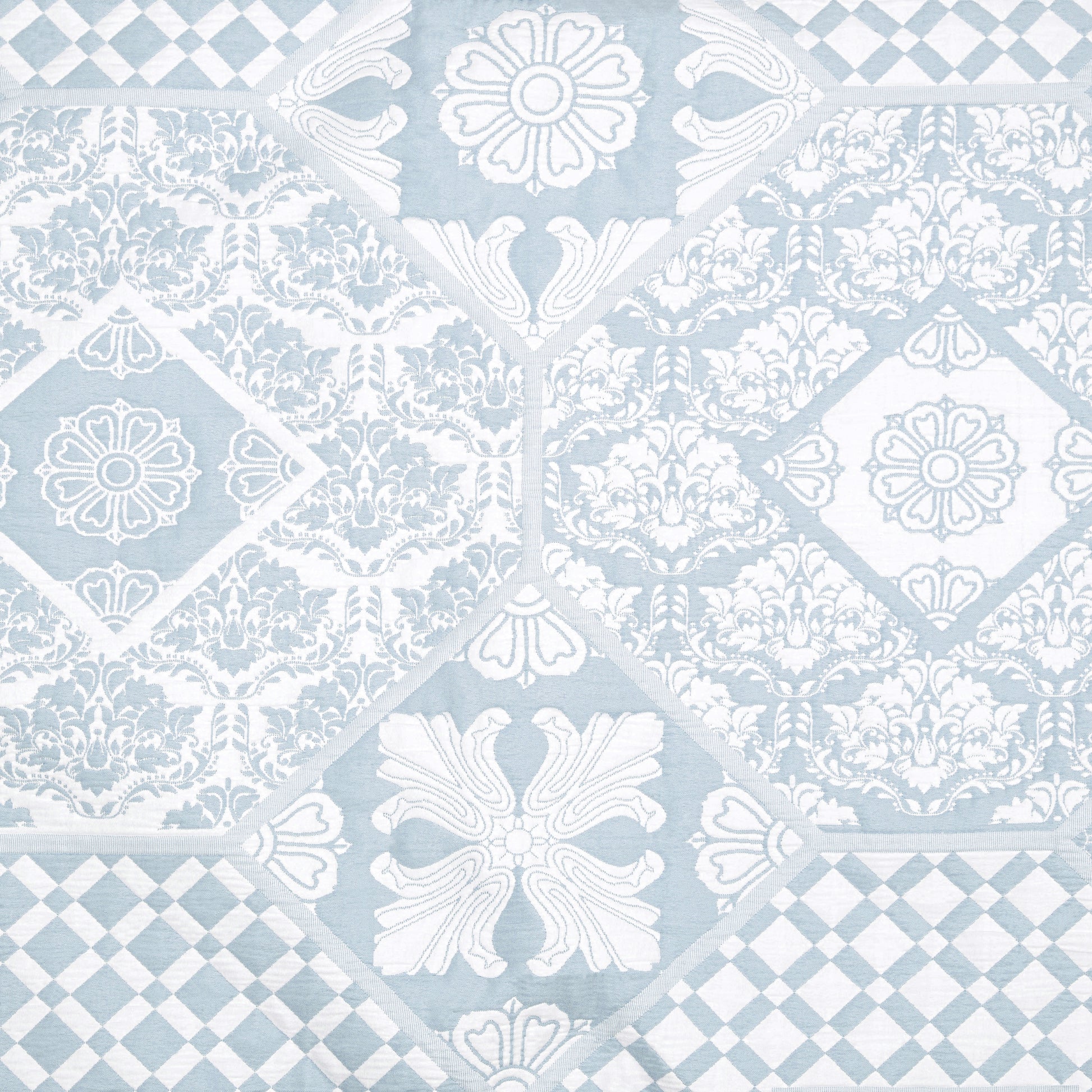 Our reversible quilted blanket set features a textured patchwork damask pattern and is available in four colors.