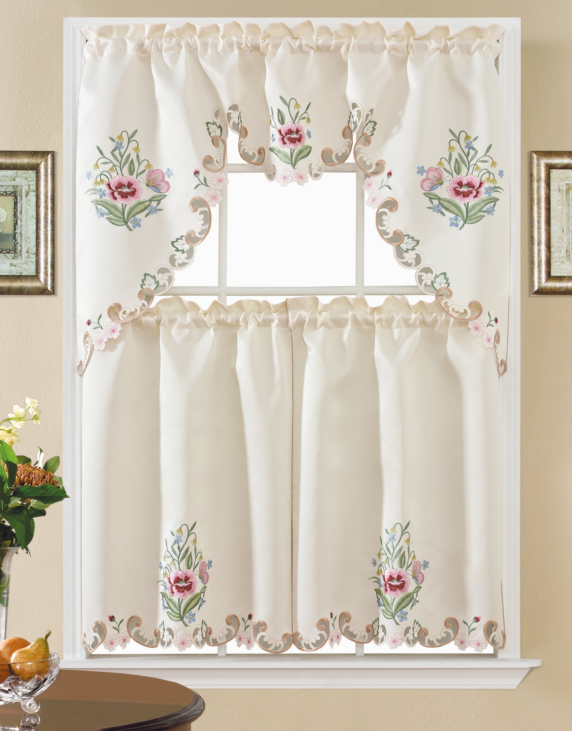 Floral embroidered kitchen window curtain on beautiful cut work satin fabric. There is also matching tablecloth available if desired. The kitchen curtain set consists of 2 curtain tiers. The valance is 58” W x 35” L. The 2 lower curtain tiers are measured 29” W x 35” L each.