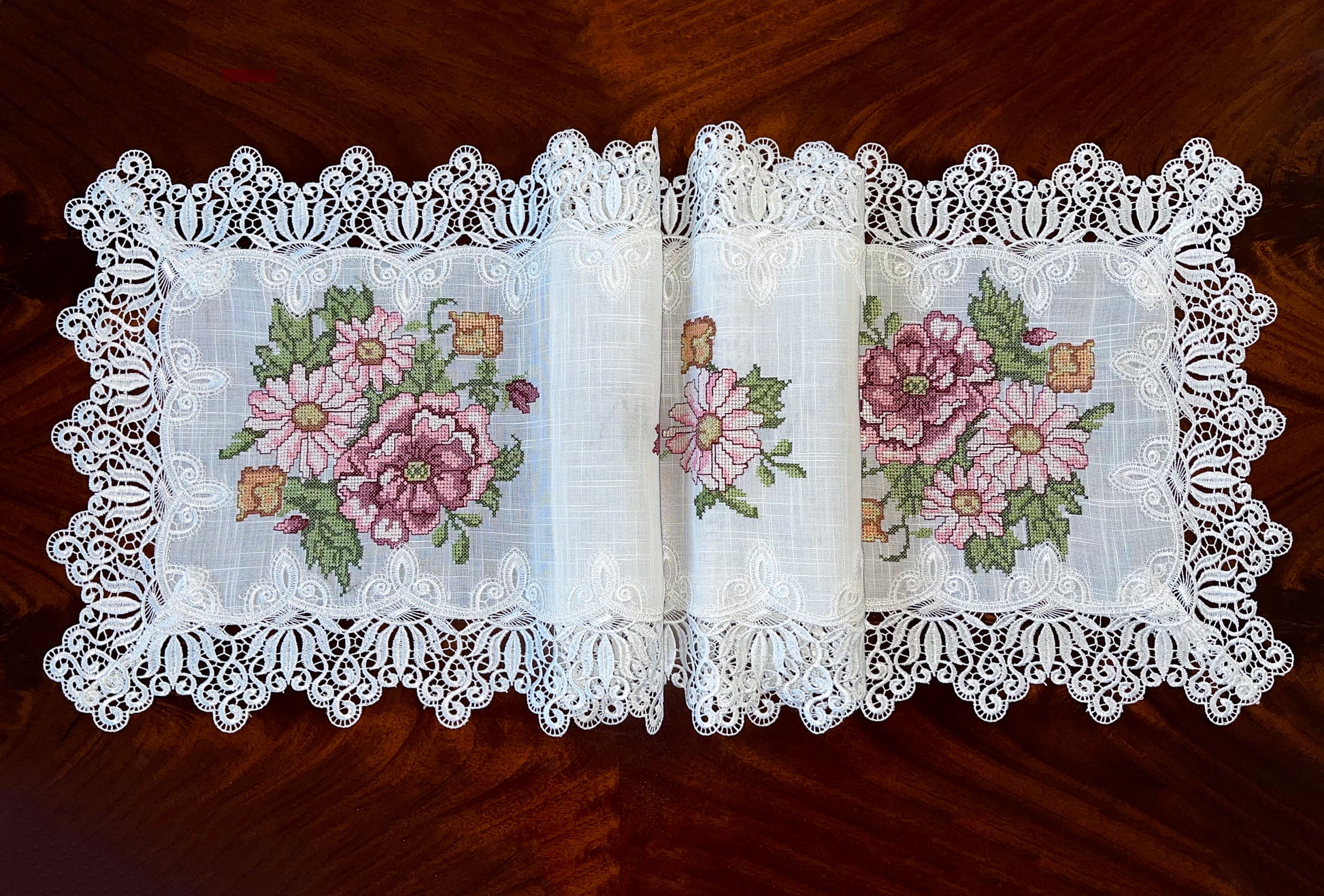 Beautiful, high-quality, laced table runners with detailed cross-stitch flowers are perfect for everyday use, weddings, and special events. This elegant collection is perfect for all year use on your dining table, dresser, or coffee table. This item is available in many different lengths to complement your table perfectly. Please select your desired size when ordering. For the best coordinated look, pair 4 placemats with a table runner.