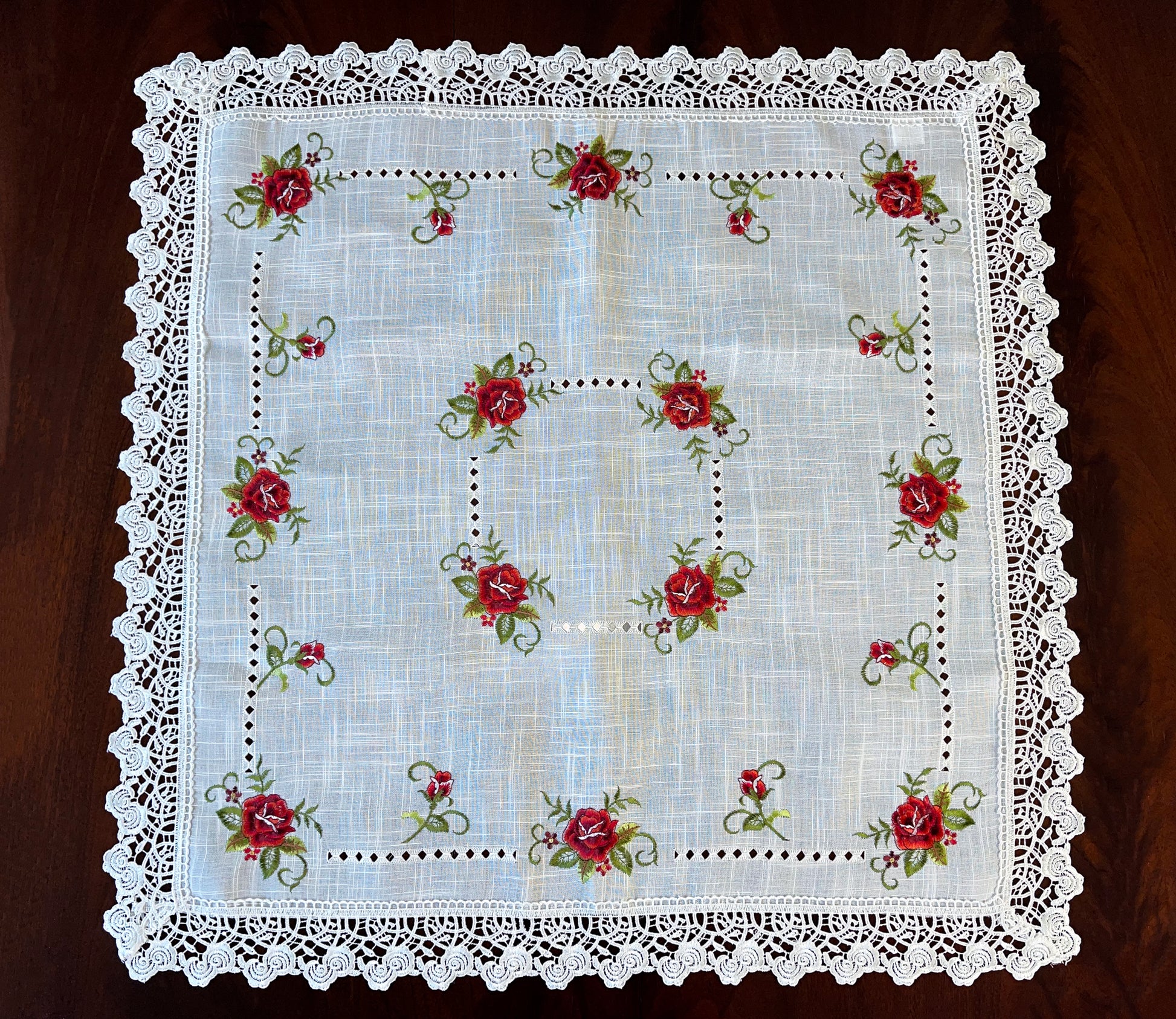 Beautiful, laced table toppers with rose embroidery are perfect for everyday use, weddings, and special events. This elegant collection is perfect for all year use on your dining table, dresser, or coffee table. There are two shapes to choose from. Both are 35" x 35", but one is round and one is square.