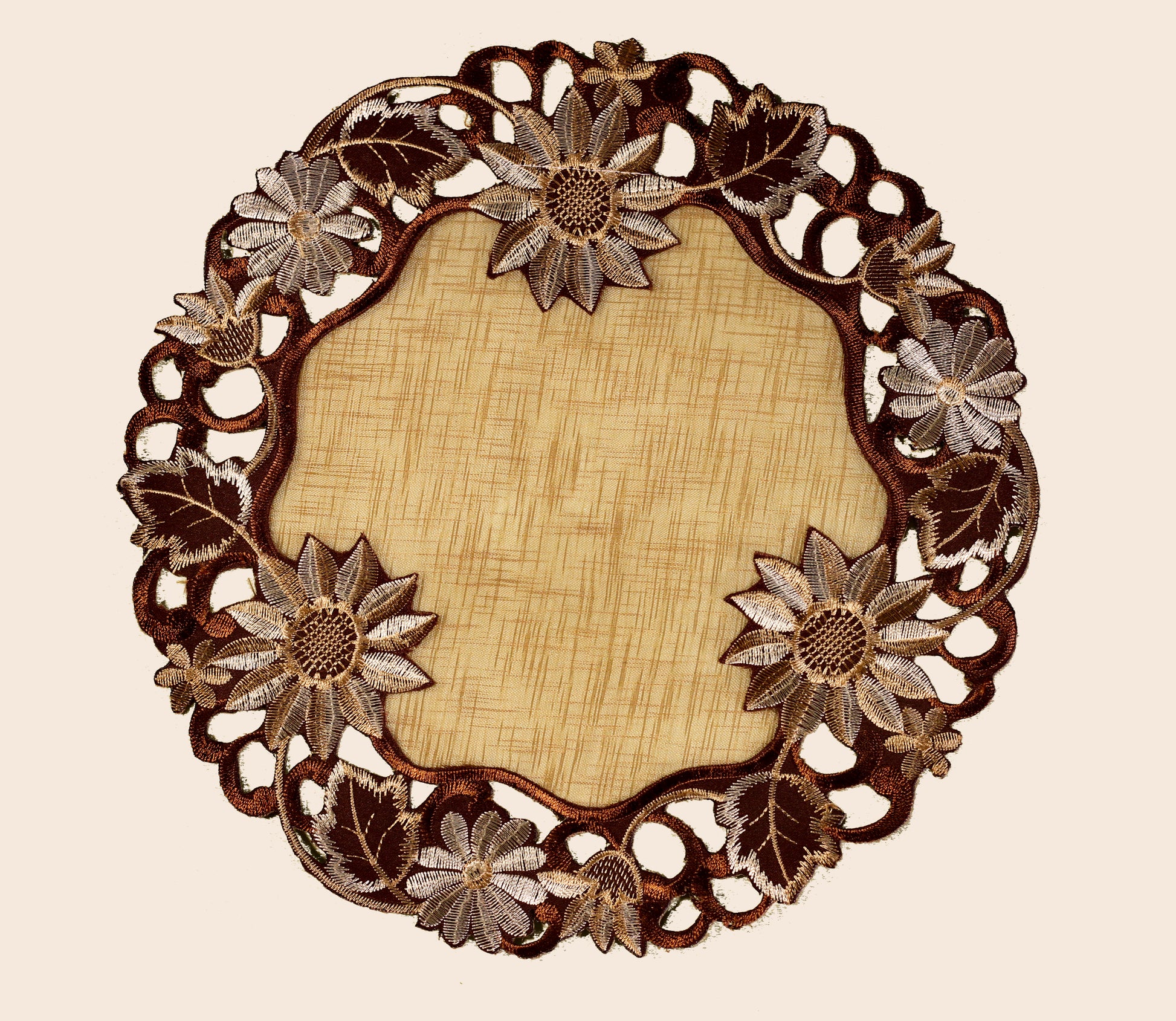 One of our most classic designs, the Riva collection features delicate brown flowers and leaves embroidered on a cutwork cloth. Riva is also available as a set of four doilies.
