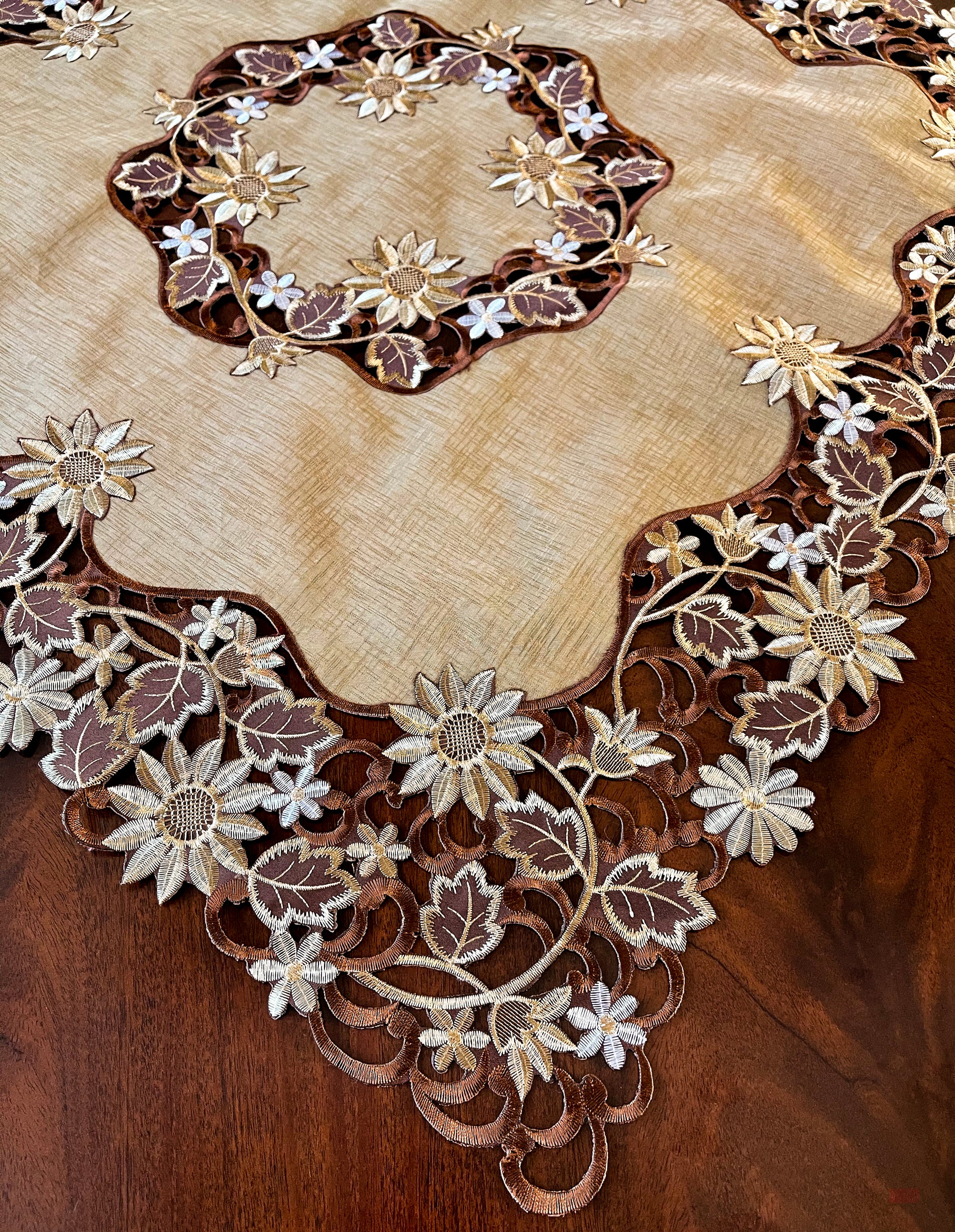One of our most classic designs, the Riva collection features delicate brown flowers and leaves embroidered on a cutwork cloth.