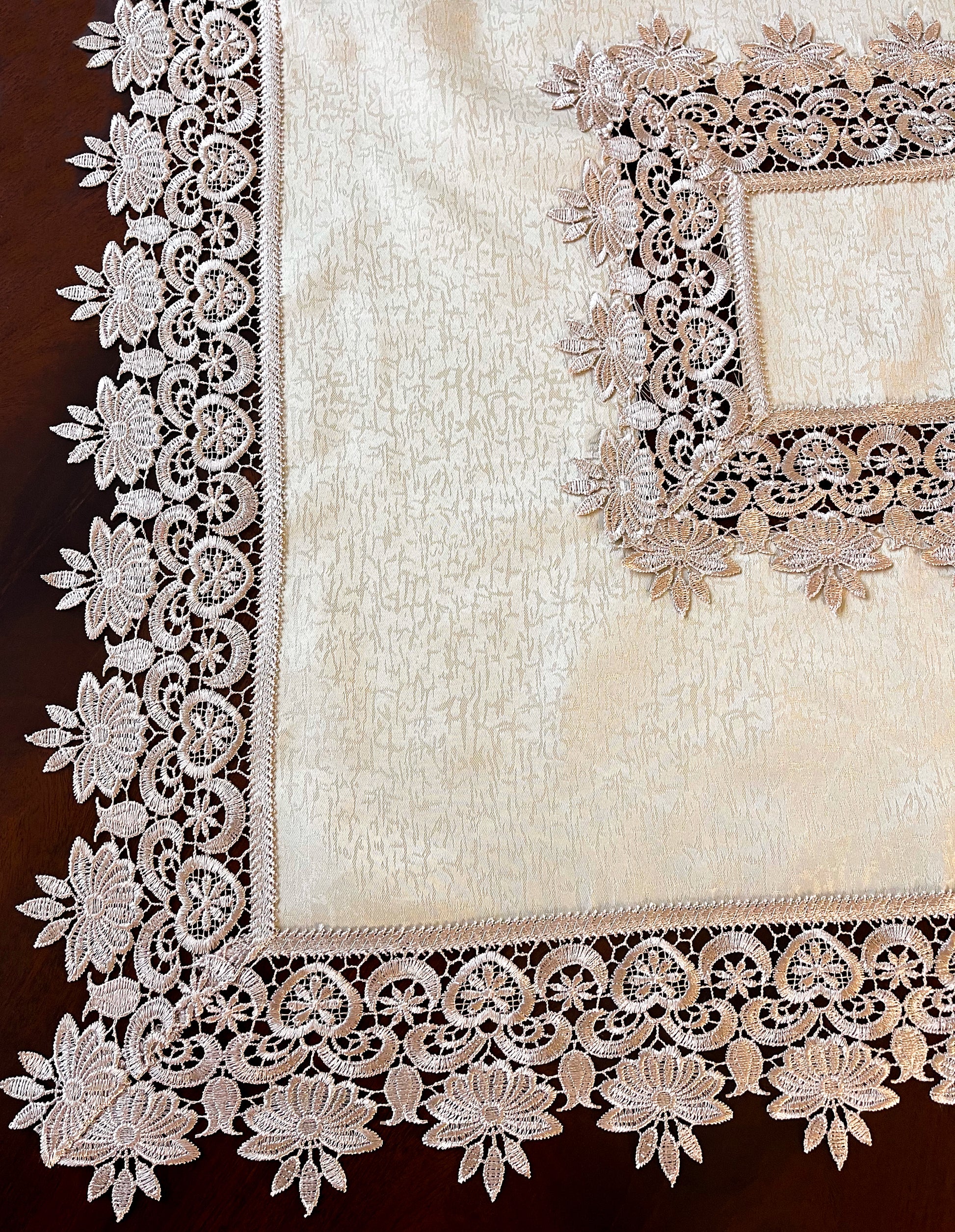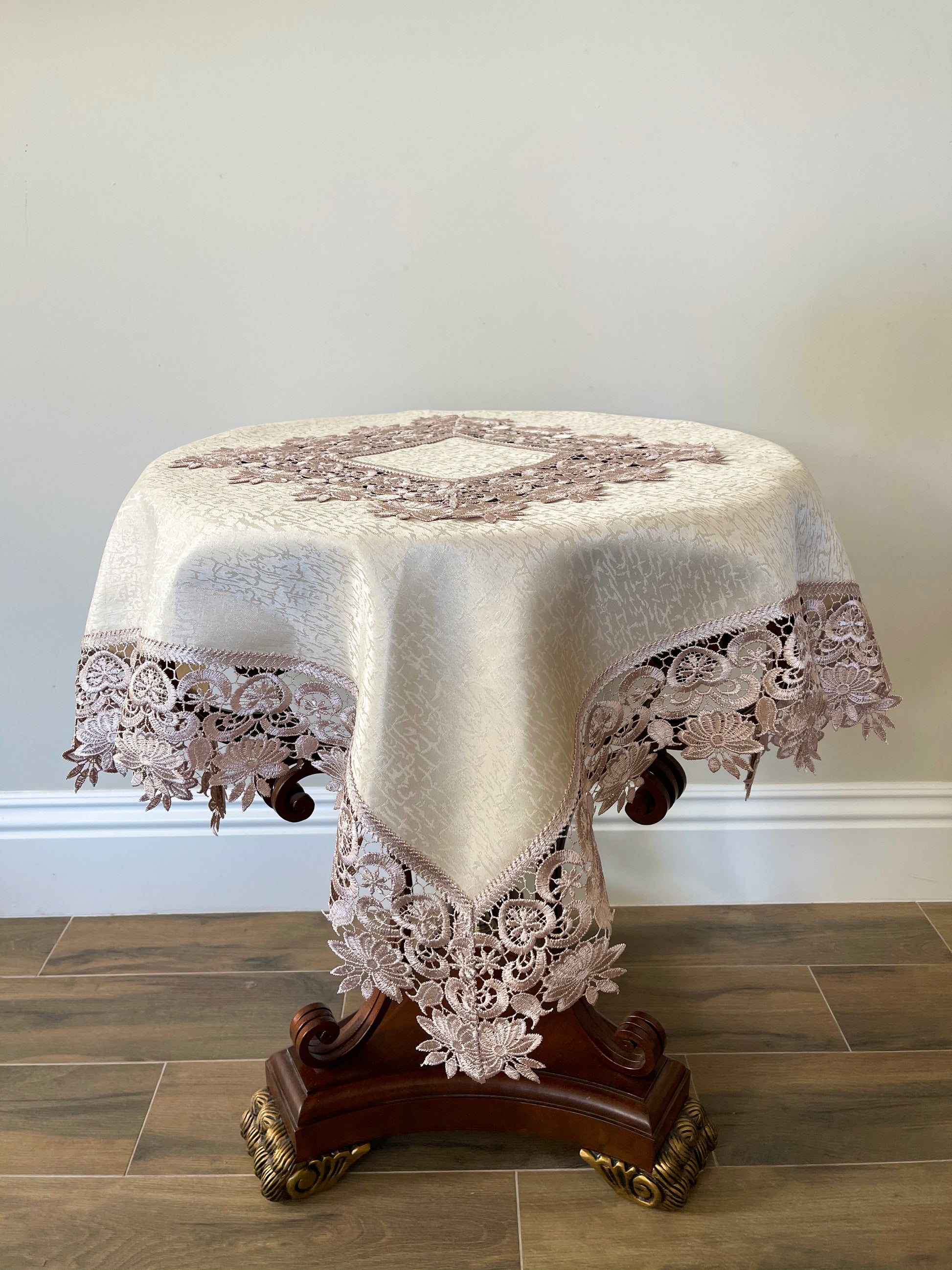 Beautiful, high quality European style lace table topper with ivory cloth is the perfect table décor all year round. This elegant collection is perfect for your dining table, dresser, or coffee table. Both the square and round versions are 35" x 35".